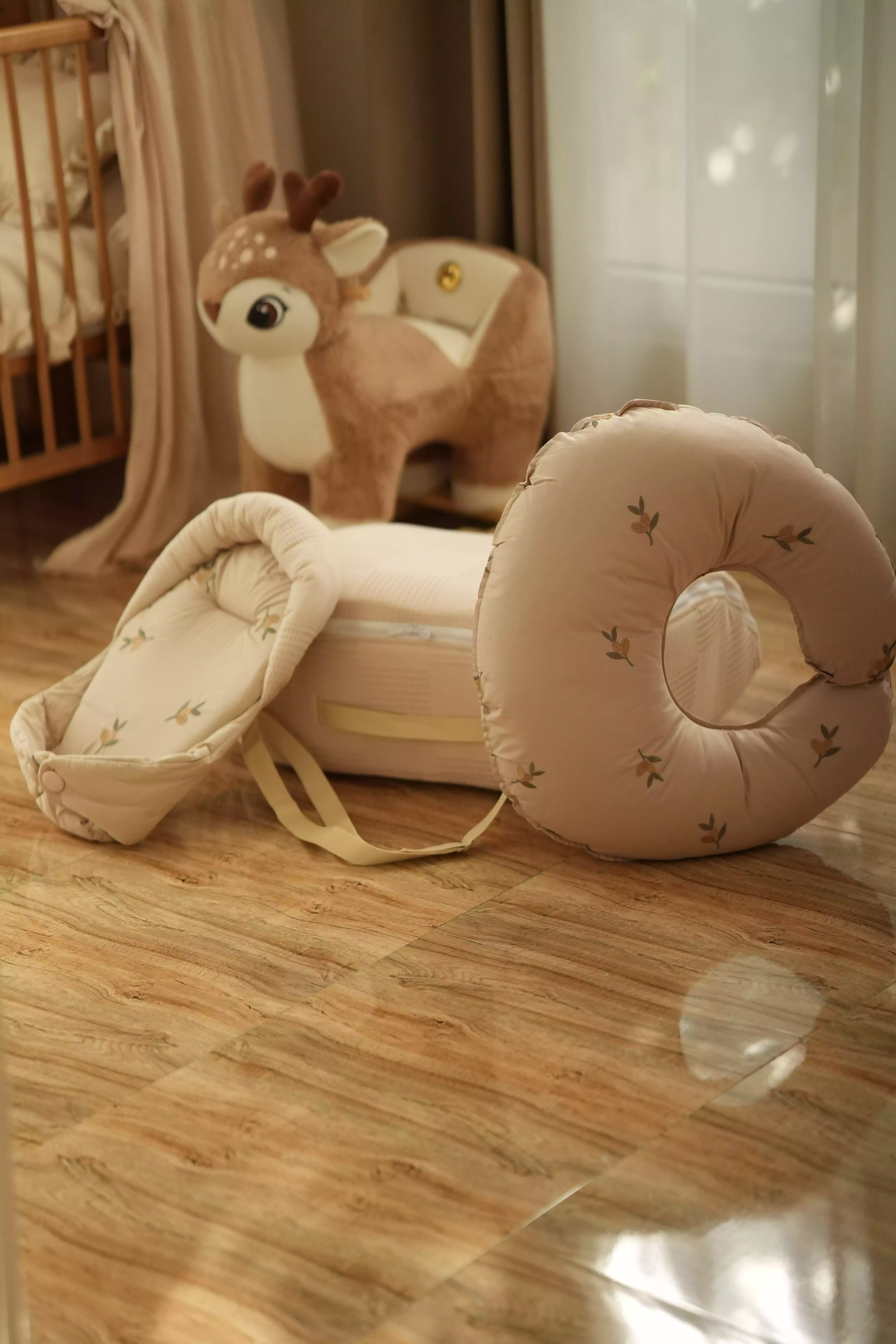 بالش فرم گیری سر، پتو با ابعاد ۷۵ در ۷۵ سانتی متر و بند پستونک و دو جیب در طرفین برای حمل شیشه شیر و پوشک